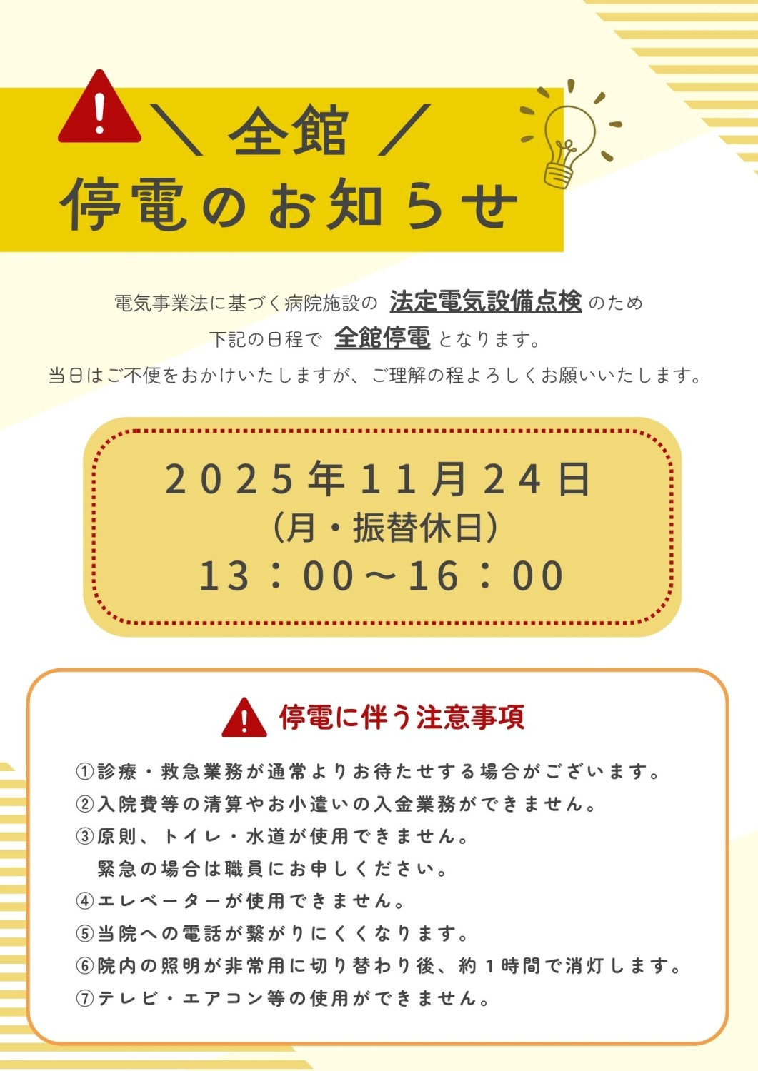 令和7年11月24日(月・振替休日)13:00~16:00の予定で、法定電気設備点検のため病院全館が停電となります。