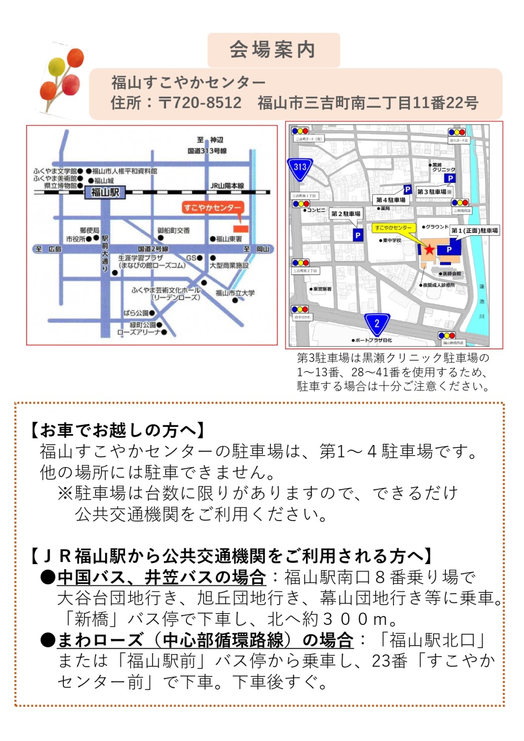 会場:福山すこやかセンター 1階 多目的ホール(福山市三吉町南2丁目11番22号)