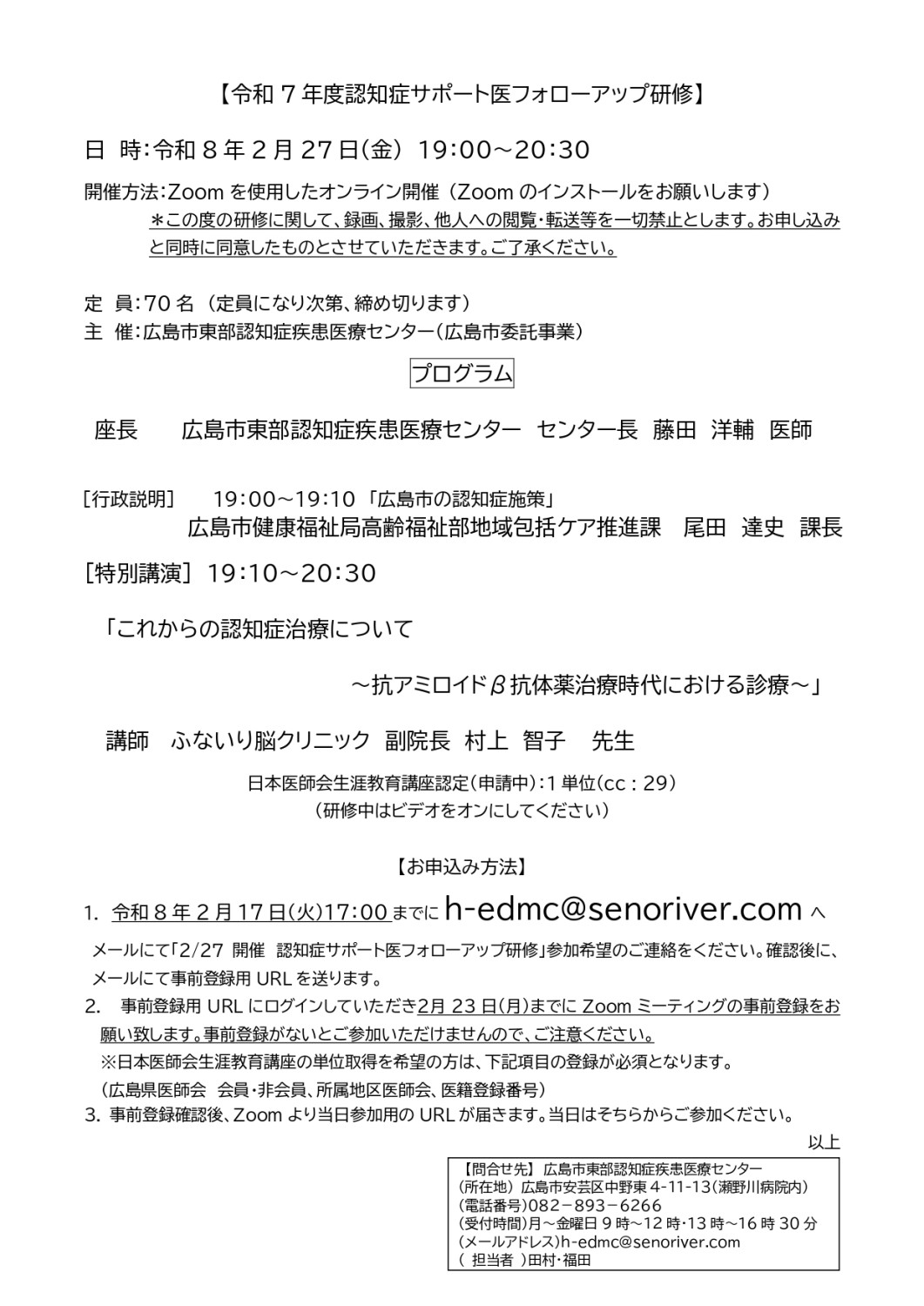 令和8年2月27日(金)19:00より、オンライン(zoom)にて、広島市東部認知症疾患医療センター主催の「令和7年度認知症サポート医フォローアップ研修」が開催されます。